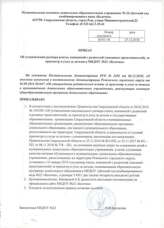 Постановление Администрации РГО о плате за присмотр и уход №2456 от 06.12.2018г.
